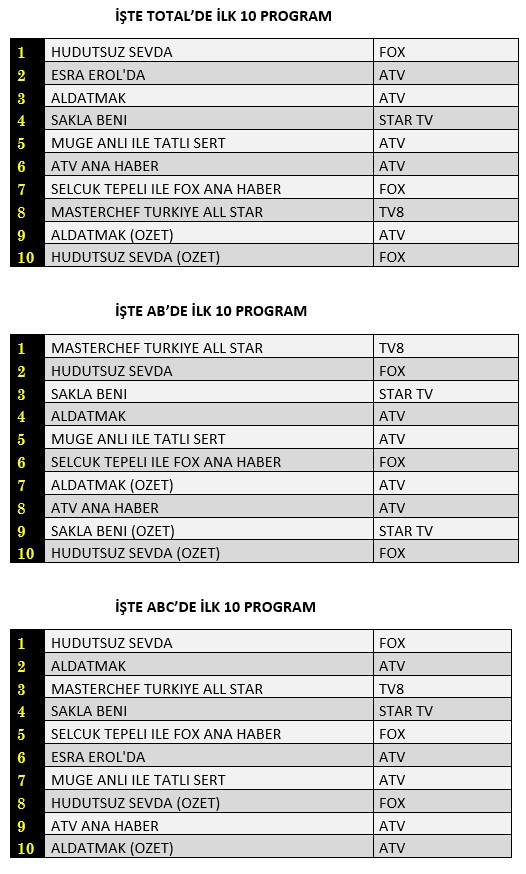 AB'de ise 1. sırada TV8’de ekrana gelen “Masterchef Türkiye All Star”, 2. sırada “Hudutsuz Sevda”, 3. sırada Star TV’de yayınlanan “Sakla Beni” yer aldı.