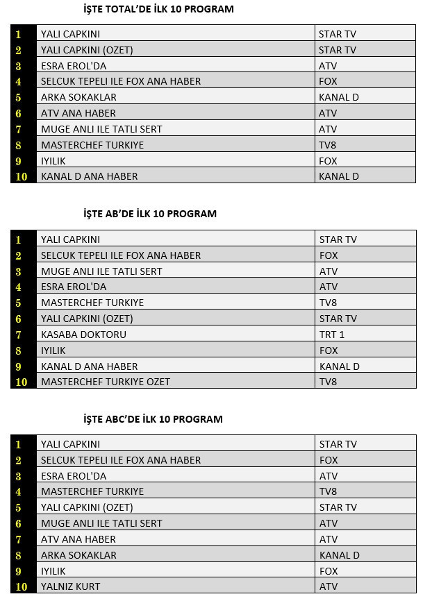 AB'de ise 1. sırada “Yalı Çapkını”, 2. sırada “Selçuk Tepeli İle Fox Ana Haber” 3. sırada Atv’de ekrana gelen “Müge Anlı İle Tatlı Sert” yer aldı.
