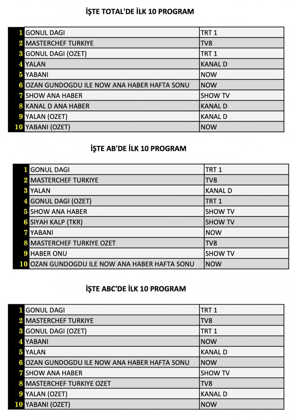 ABC’de 1. sırada “Gönül Dağı”,  2. sırada “MasterChef Türkiye”, 3. sırada ise “Gönül Dağı” özet bölümü yer aldı.