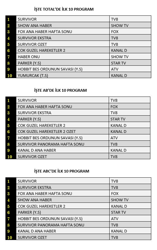 Total'de 1. sırada TV8’de ekrana gelen “Survivor”, 2. sırada “Show Ana Haber”, 3. sırada “Fox Ana Haber Hafta Sonu” yer aldı.