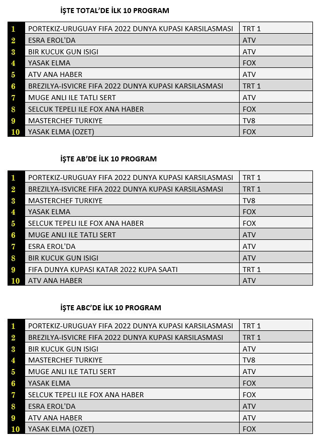 Total'de 1.sırada TRT1’de izleyiciyle buluşan “Portekiz-Uruguay FİFA 2022 Dünya Kupası Karşılaşması”, 2. sırada Atv’de ekrana gelen “Esra Erol’da”, 3.sırada Atv’de yayınlanan “Bir Küçük Gün Işığı” yer aldı.
