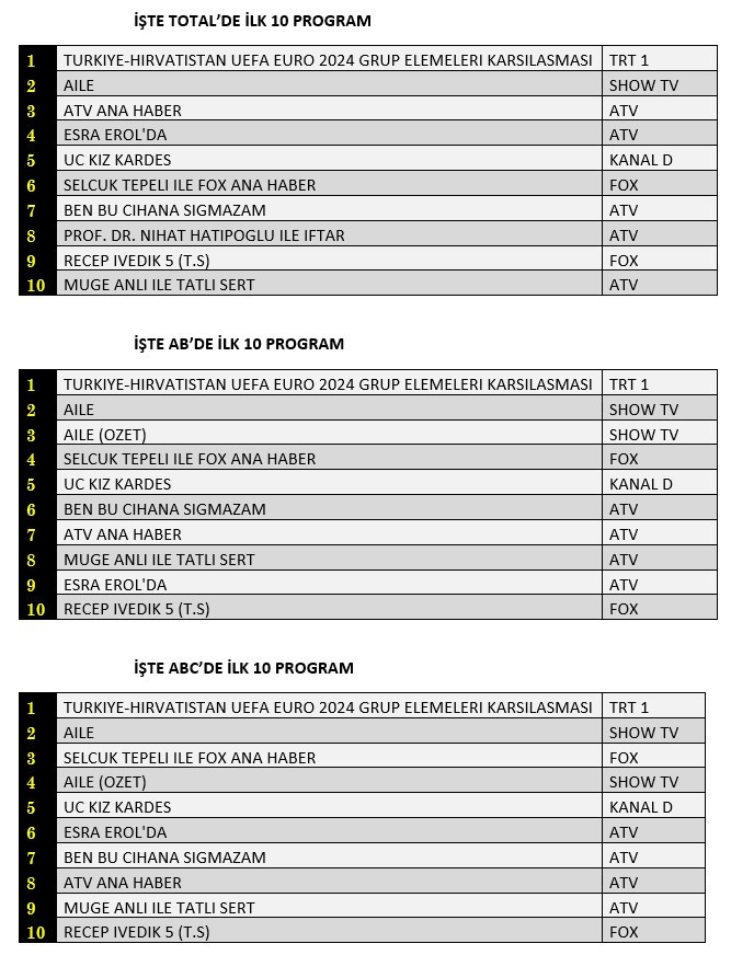 Total'de 1. sırada TRT1’de izleyiciyle buluşan “Türkiye-Hırvatistan UEFA Euro 2024 Grup Elemeleri Karşılaşması”, 2. sırada Show TV’de ekrana gelen “Alie”, 3.sırada “Atv Ana Haber” yer aldı.