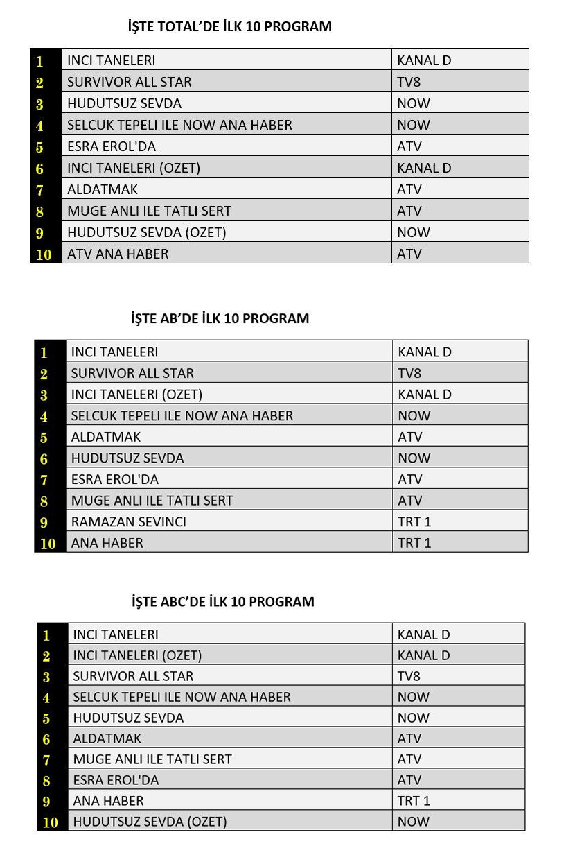 AB'de ise 1.sırada “İnci Taneleri”, 2.sırada “Survivor All Star”, 3.sırada “İnci Taneleri” dizisinin özeti yer aldı.