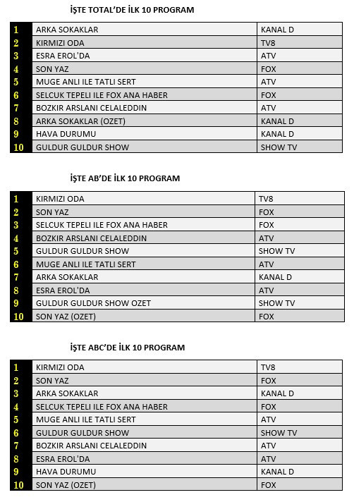Total'de 1. sırada Kanal D’de ekrana gelen “Arka Sokaklar”, 2. sırada TV8’de yayınlanan “Kırmızı Oda”, 3. sırada ATV’de izleyiciyle buluşan “Esra Erol’da” programı yer aldı.