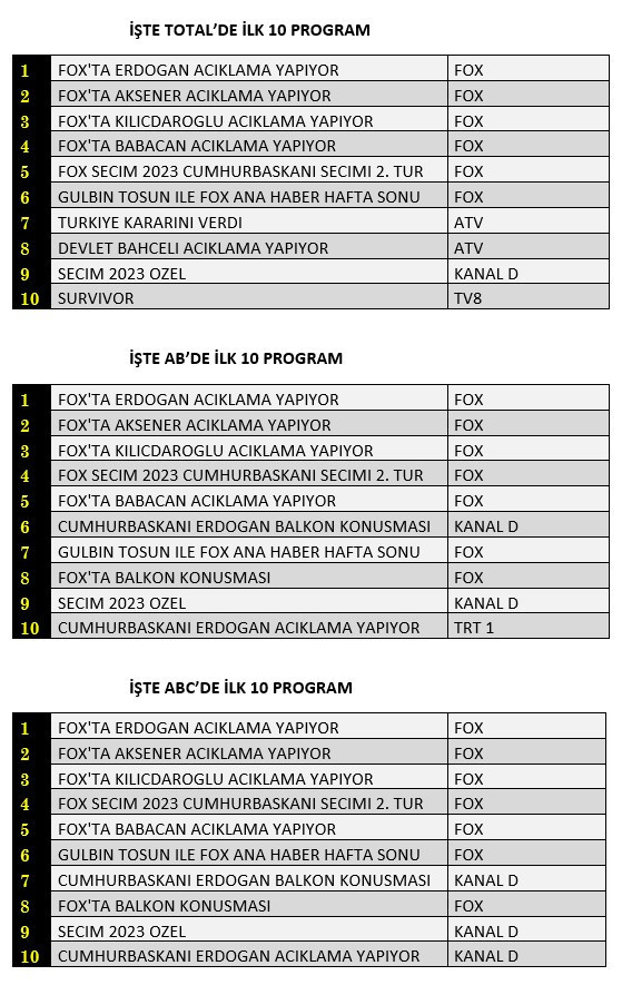 AB'de ise birinci sırada "Fox'ta Erdoğan Açıklama Yapıyor", ikinci sırada "Fox'ta Akşener Açıklama Yapıyor" ve üçüncü sırada "Fox'ta Kılıçdaroğlu Açıklama Yapıyor" programları yer aldı.
