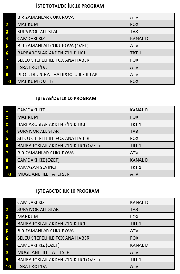 Total'de 1. sırada ATV’de izleyiciyle buluşan “Bir Zamanlar Çukurova”, 2. sırada Fox TV’de yayınlanan “Mahkum”, 3. sırada TV8’de ekrana gelen “Survivor All Star” yer aldı.