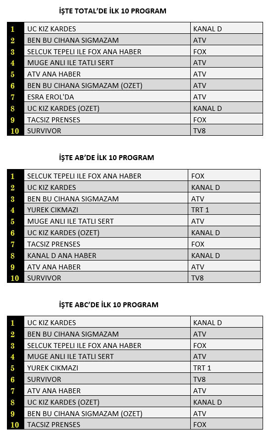 AB'de ise 1.sırada “Selçuk Tepeli İle Fox Ana Haber”, 2.sırada “Üç Kız Kardeş”, 3.sırada “Ben Bu Cihana Sığmazam” yer aldı.