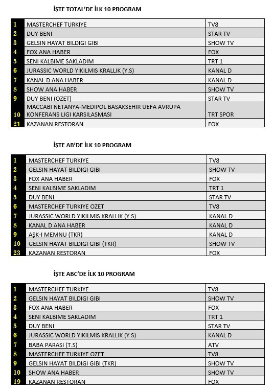 AB'de ise 1. sırada “Masterchef Türkiye”, 2. sırada “Gelsin Hayat Bildiği Gibi” 3. sırada “Fox Ana Haber” yer aldı.