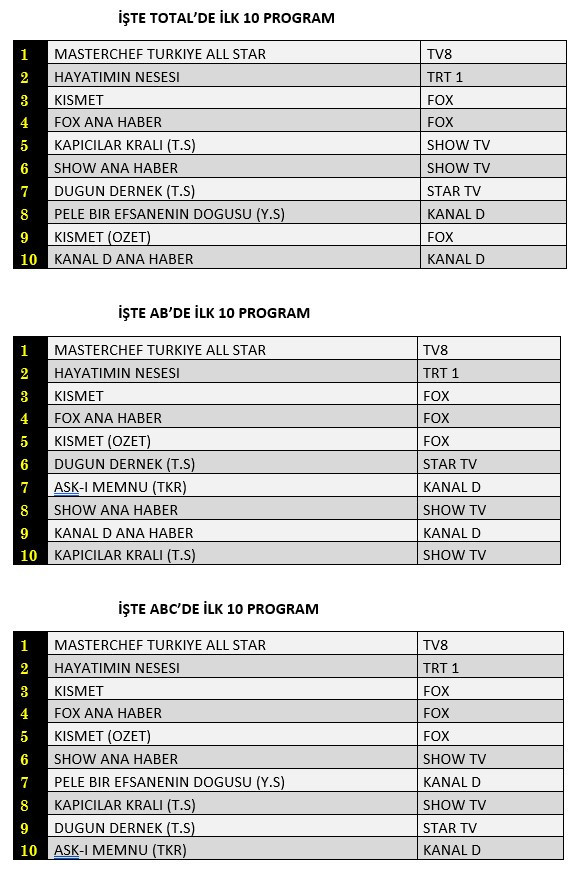 AB'de ise 1. sırada “Masterchef Türkiye All Star”, 2. sırada “Hayatımın Neşesi”, 3. sırada “Kısmet” yer aldı.