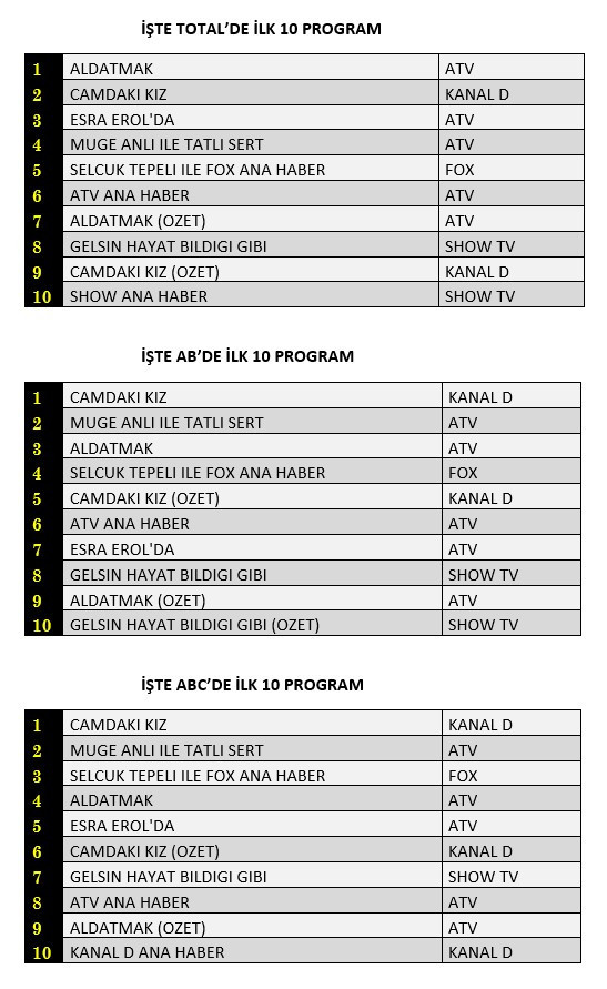 Total'de 1. sırada Atv’de izleyiciyle buluşan “Aldatmak”, 2. sırada Kanal D’de ekrana gelen “Camdaki Kız”, 3. sırada Atv’de yayınlanan “Esra Erol’da” yer aldı.