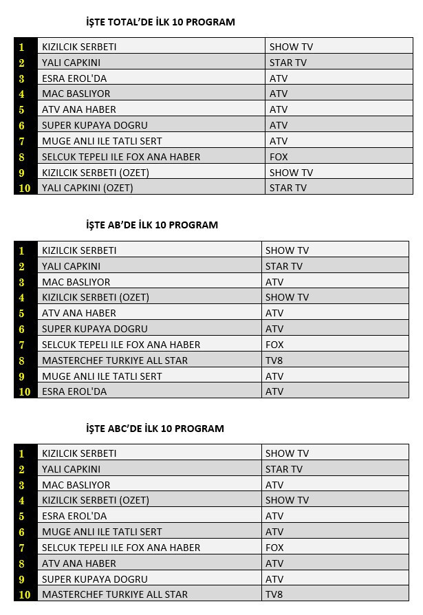 AB'de ise 1. sırada “Kızılcık Şerbeti”, 2. sırada “Yalı Çapkını”, 3. sırada ATV’de ekrana gelen “Maç Başlıyor” yayını yer aldı.