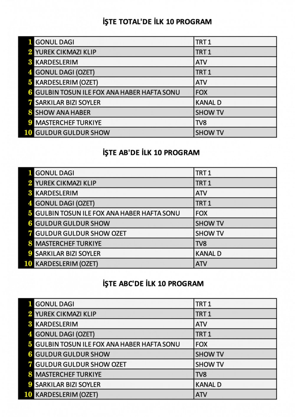 Total’de 1. sırada TRT 1’de izleyici ile buluşan “Gönül Dağı”, 2. sırada 1 Kasım’da TRT 1’de ekranlara gelmeye hazırlanan “Yürek Çıkmazı” dizisinden özel bir klip, 3. sırada ise ATV’de yayınlanan “Kardeşlerim” yer aldı.
