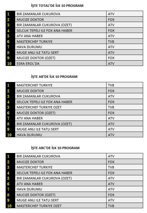 Total'de 1. sırada ATV’de yayınlanan “Bir Zamanlar Çukurova”, 2. sırada Fox TV’de ekrana gelen “Mucize Doktor”, 3. sırada “Bir Zamanlar Çukurova”nın özeti yer aldı.