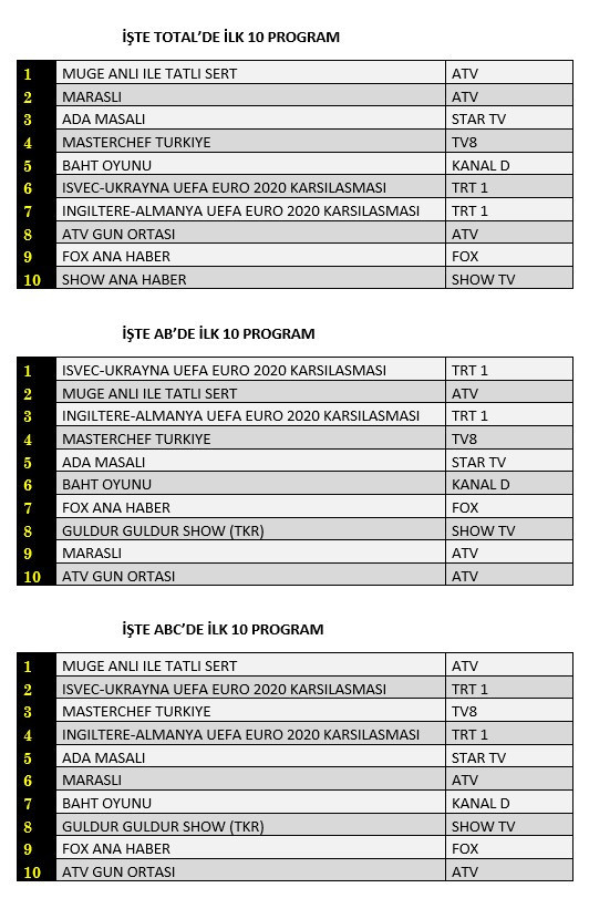 AB'de ise 1. sırada TRT1’de yayınlanan “İsveç-Ukrayna UEFA Euro 2020 Karşılaşması”, 2. sırada “Müge Anlı İle Tatlı Sert”, 3. sırada TRT1’de ekrana gelen “İngiltere-Almanya UEFA Euro 2020 Karşılaşması” yer aldı.