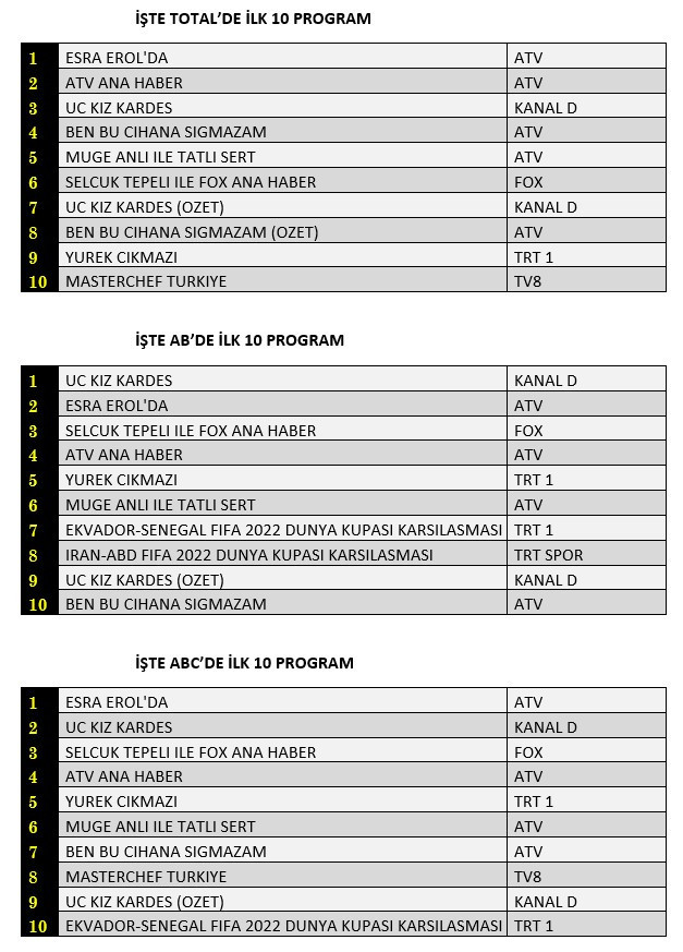 AB'de ise 1. sırada “Üç Kız Kardeş”, 2. sırada “Esra Erol’da” 3 .sırada “Selçuk Tepeli İle Fox Ana Haber” yer aldı.
