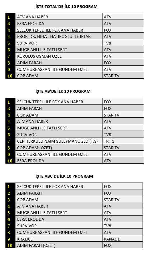 AB'de ise 1. sırada “Selçuk Tepeli İle Fox Ana Haber”, 2. sırada Fox TV’de yayınlanan “Adım Farah”, 3. sırada Star TV’de ekrana gelen “Çöp Adam” yer aldı.