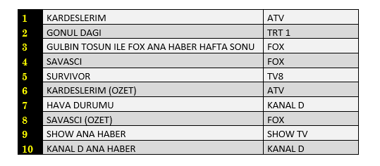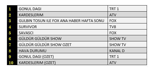 Total'de 1.sırada ATV’de ekrana gelen “Kardeşlerim”, 2. sırada TRT1’de yayınlanan “Gönül Dağı”, 3.sırada “Gülbin Tosun İle Fox Ana Haber Hafta Sonu” yer aldı.
