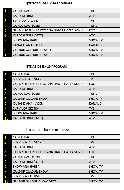 Total'de 1.sırada TRT1’de yayınlanan “Gönül Dağı” 2. sırada ATV’de izleyiciyle buluşan “Kardeşlerim”, 3.sırada TV8’de ekrana gelen “Survivor All Star” yer aldı.