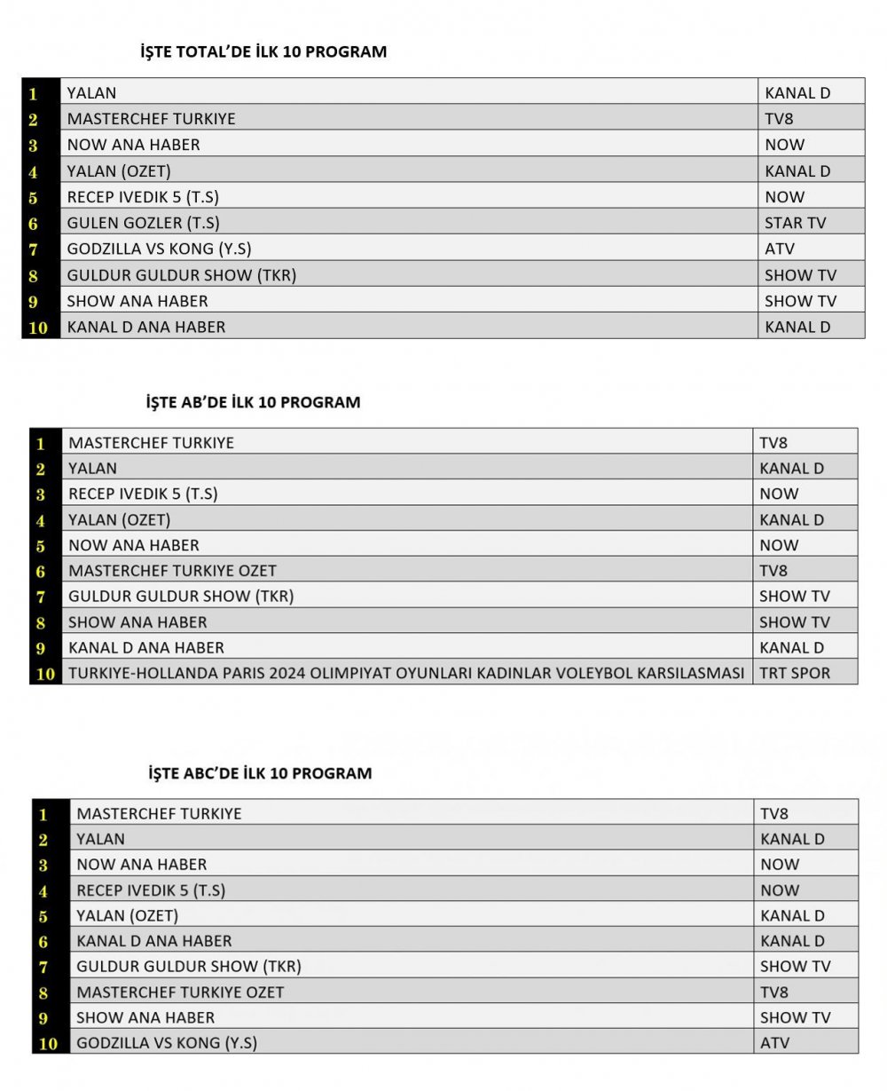 ABC'de ise 1.sırada “Masterchef Türkiye”, 2.sırada “Yalan”, 3.sırada “Now Ana Haber” yer aldı.
