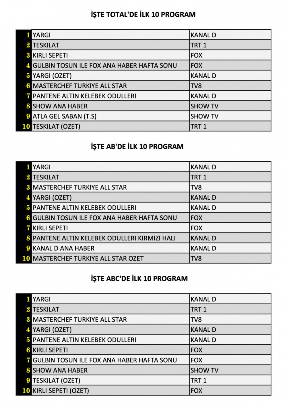 Total’de 1. sırada Kanal D’de izleyici ile buluşan “Yargı”, 2. sırada TRT 1’de ekranlara gelen “Teşkilat”, 3. sırada ise Fox’ta yayınlanan “Kirli Sepeti” yer aldı.