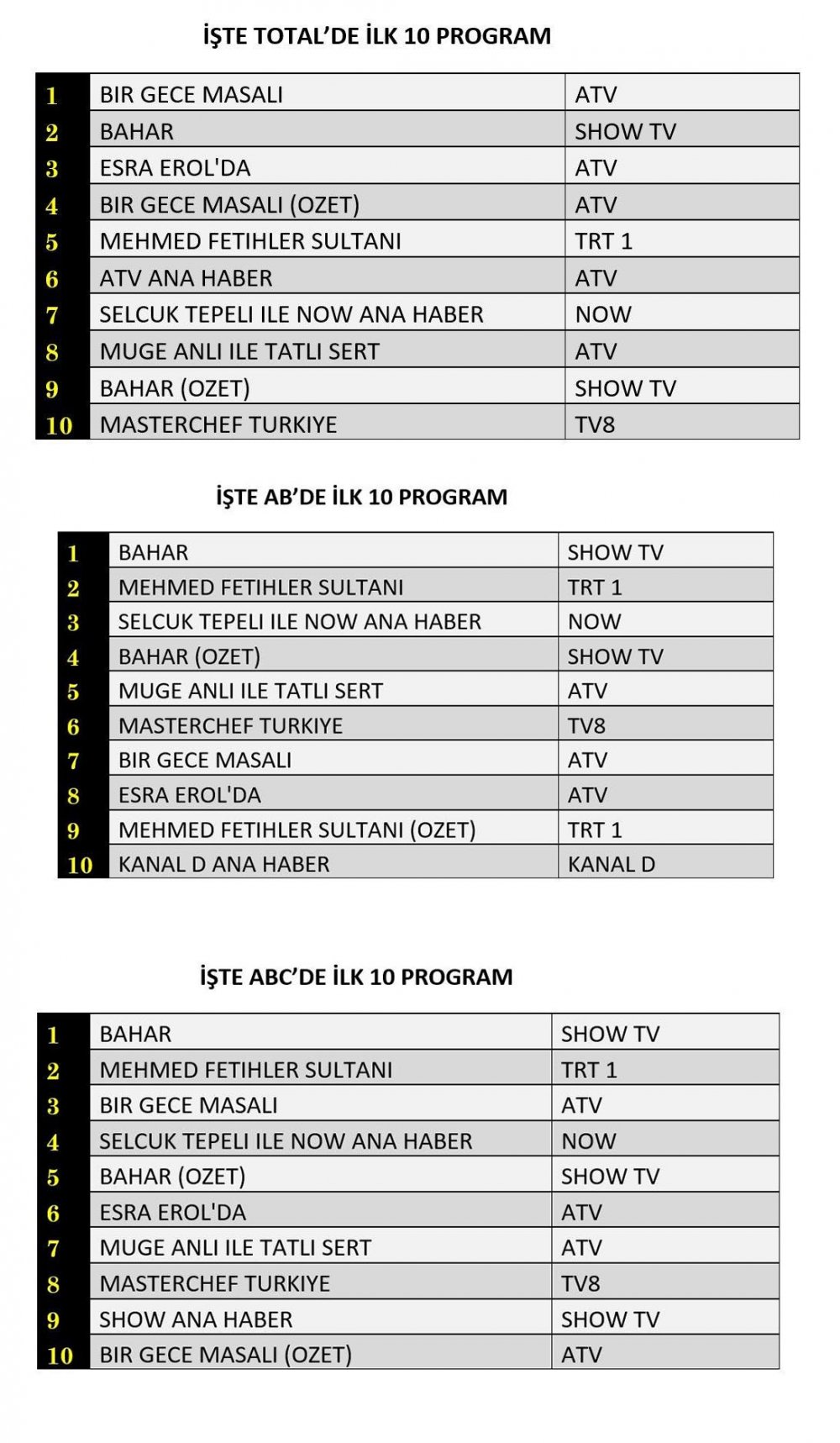 AB Kategorisinde 1. sırayı Show TV’nin iddialı yapımı Bahar aldı. 2. sırada TRT 1 ekranlarında izleyiciyle buluşan Mehmed Fetihler Sultanı yer aldı. 3. sırada ise Selçuk Tepeli İle Now Ana Haber bulunuyor.