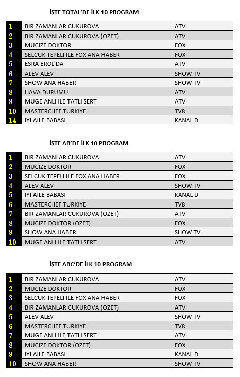 AB'de ise 1. sırada “Bir Zamanlar Çukurova”, 2.sırada “Mucize Doktor”, 3. sırada “Selçuk Tepeli İle Fox Ana Haber” yer aldı.