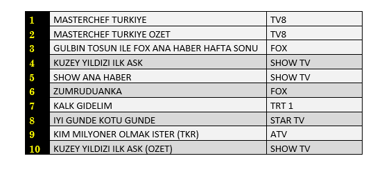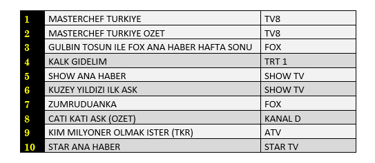 Total'de 1. sırada TV8’de yayınlanan “Mastercheff Türkiye”, 2. sırada Show TV’de ekrana gelen “Kuzey Yıldızı İlk Aşk”, 3. sırada “Gülbin Tosun İle Fox Ana Haber Hafta Sonu” yer aldı.