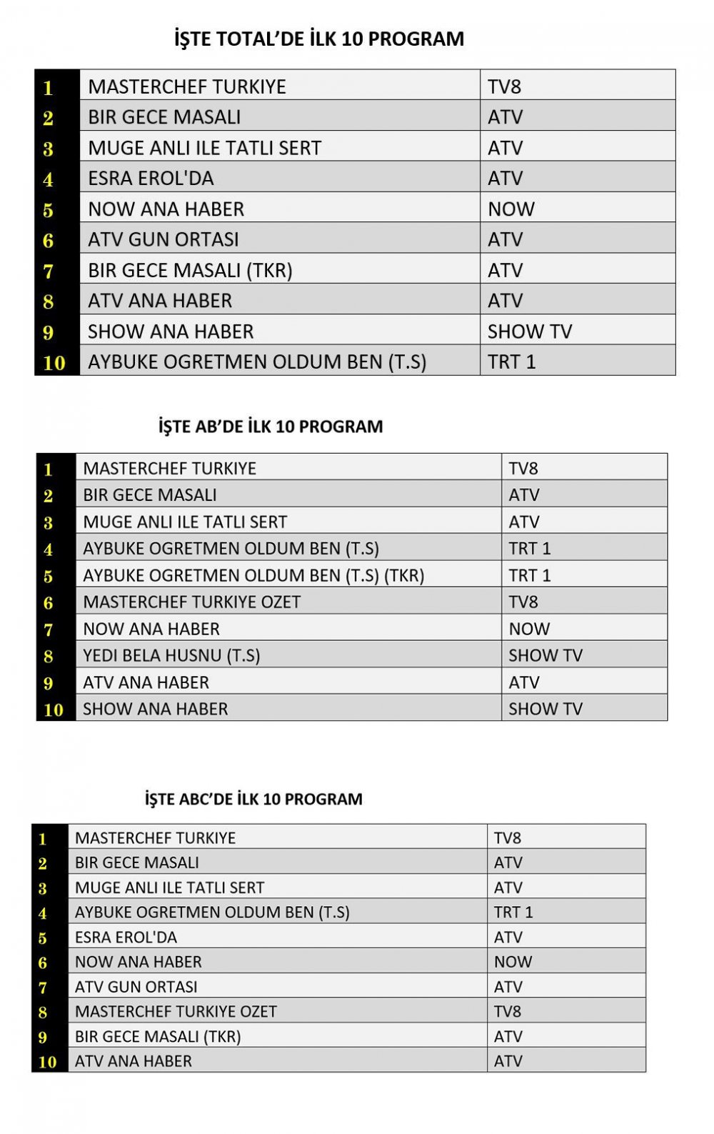 ABC'de ise 1.sırada “Masterchef Türkiye”, 2.sırada “Bir Gece Masalı”, 3.sırada “Müge Anlı İle Tatlı Sert” yer aldı.