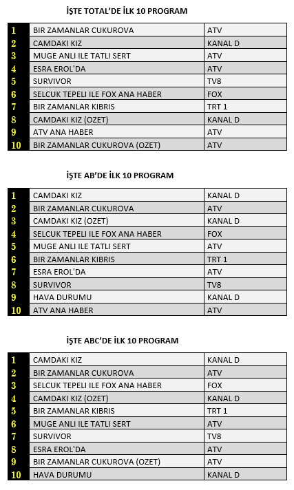Total'de 1. sırada ATV’de ekrana gelen “Bir Zamanlar Çukurova”, 2. sırada Kanal D’de yayınlanan “Camdaki Kız”, 3. sırada ATV’de izleyiciyle buluşan “Müge Anlı İle Tatlı Sert” programı yer aldı.