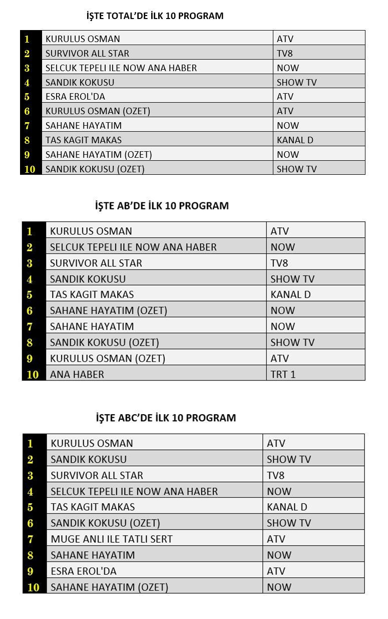 AB'de 1.sırada “Kuruluş Osman”, 2.sırada “Selçuk Tepeli İle Now Ana Haber”, 3.sırada “Survivor All Star” yer aldı.