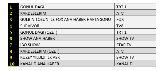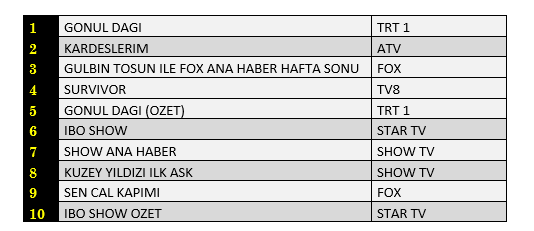 Total'de 1.sırada TRT1’de ekrana gelen “Gönül Dağı”, 2. Sırada ATV’de yayınlanan “Kardeşlerim”, 3.sırada TV8'de yayınlanan "Survivor" yarışması yer aldı.