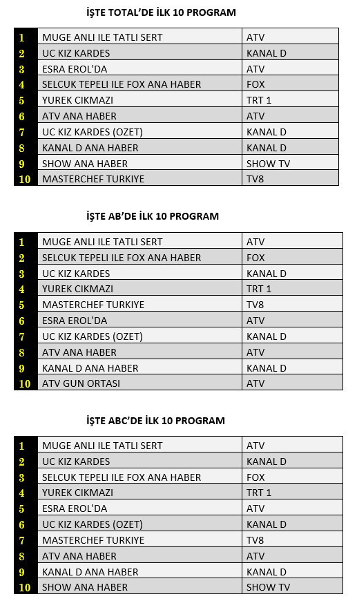 AB'de ise 1. sırada “Müge Anlı İle Tatlı Sert”, 2. sırada yine “Selçuk Tepeli İle Fox Ana Haber”, 3. sırada “Üç Kız Kardeş” yer aldı.