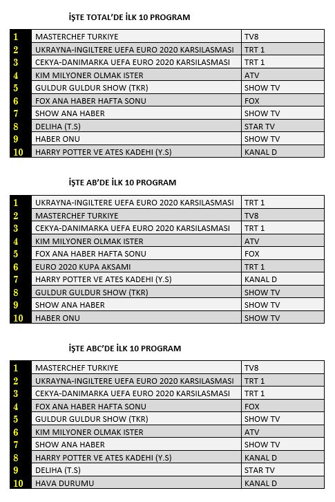 Total'de 1.sırada TV8’de ekrana gelen “Masterchef Türkiye”, 2. sırada TRT1’de yayınlanan “Ukrayna-İngiltere UEFA Euro 2020 Karşılaşması”, 3.sırada TRT1’de izleyiciyle buluşan “Çekya-Danimarka UEFA Euro 2020 Karşılaşması” yer aldı.