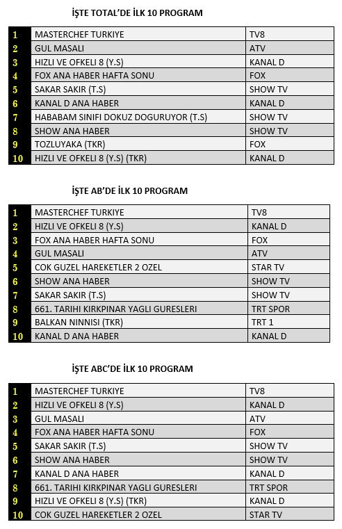 AB'de ise 1. sırada “Masterchef Türkiye”, 2. sırada “Hızlı ve Öfkeli 8”, 3. sırada “Fox Ana Haber Hafta Sonu” yer aldı.