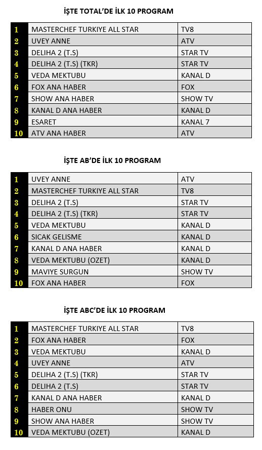 AB'de ise 1. sırada “Üvey Anne”, 2. sırada “Masterchef Türkiye All Star”, 3. sırada “Deliha 2” yer aldı.
