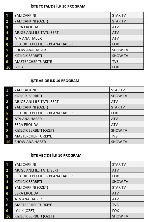AB'de ise 1. sırada “Yalı Çapkını”, 2. sırada Show TV’de yayınlanan “Kızılcık Şerbeti”, 3. sırada Atv’de yayınlanan “Müge Anlı İle Tatlı Sert” yer aldı.