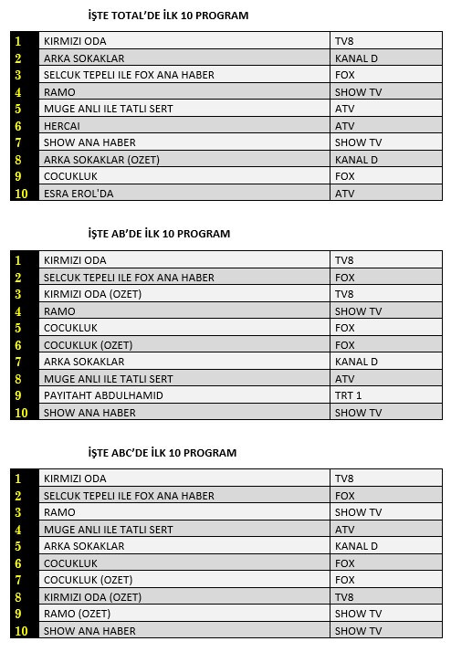 Total'de 1. sırada TV8’de yayınlanan “Kırmızı Oda”, 2. sırada Kanal D’de ekrana gelen “Arka Sokaklar”, 3. sırada “Selçuk Tepeli İle Fox Ana Haber” yer aldı.