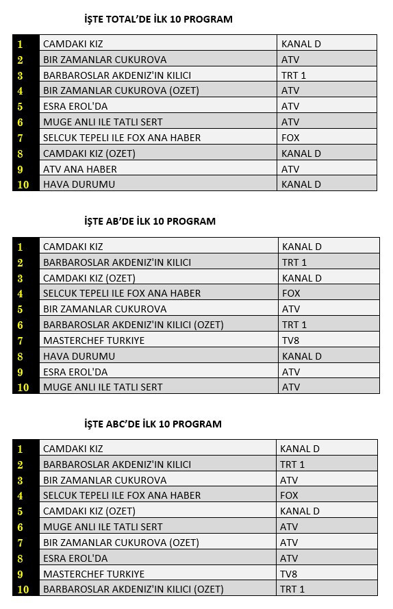 Total'de 1. sırada Kanal D’de yayınlanan “Camdaki Kız”, 2. sırada ATV’de izleyiciyle buluşan “Bir Zamanlar Çukurova”, 3. sırada TRT1’de ekrana gelen “Barbaroslar Akdeniz’in Kılıcı” yer aldı.