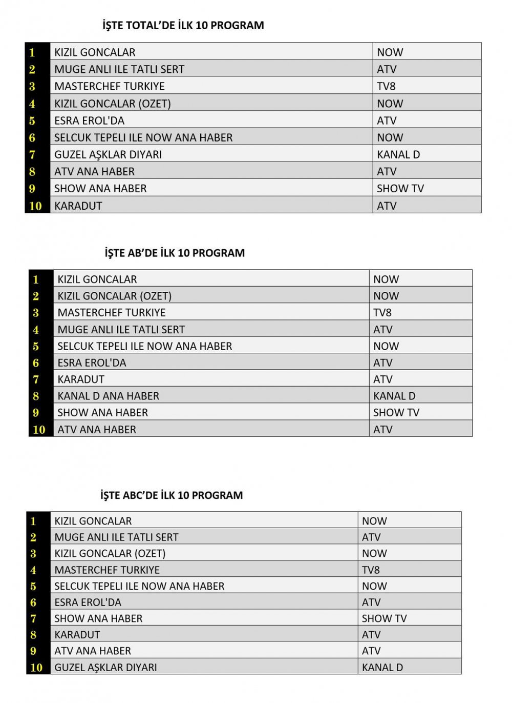 ABC'de ise 1.sırada “Kızıl Goncalar”, 2.sırada “Müge Anlı İle Tatlı Sert”, 3.sırada “Kızıl Goncalar” dizisinin özeti yer aldı.