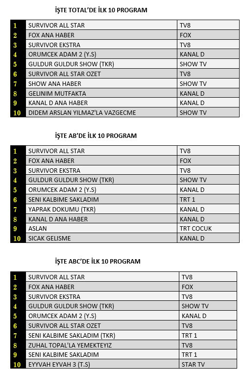 Total'de 1. sırada TV8’de izleyiciyle buluşan “Survivor All Star”, 2. sırada “Fox Ana Haber”, 3. sırada TV8’de yayınlanan “Survivor Ekstra” yer aldı.