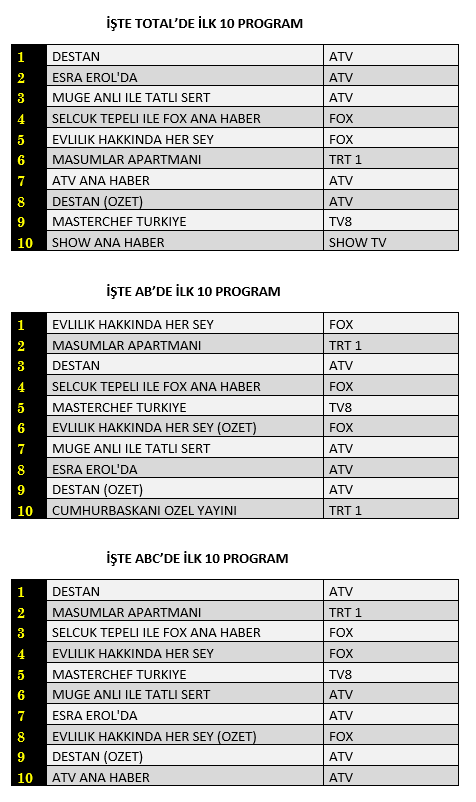 AB'de ise 1. sırada Fox TV’de yayınlanan “Evlilik Hakkında Her Şey”, 2. sırada TRT1’de ekrana gelen “Masumlar Apartmanı” 3. sırada “Destan” dizisi yer aldı.