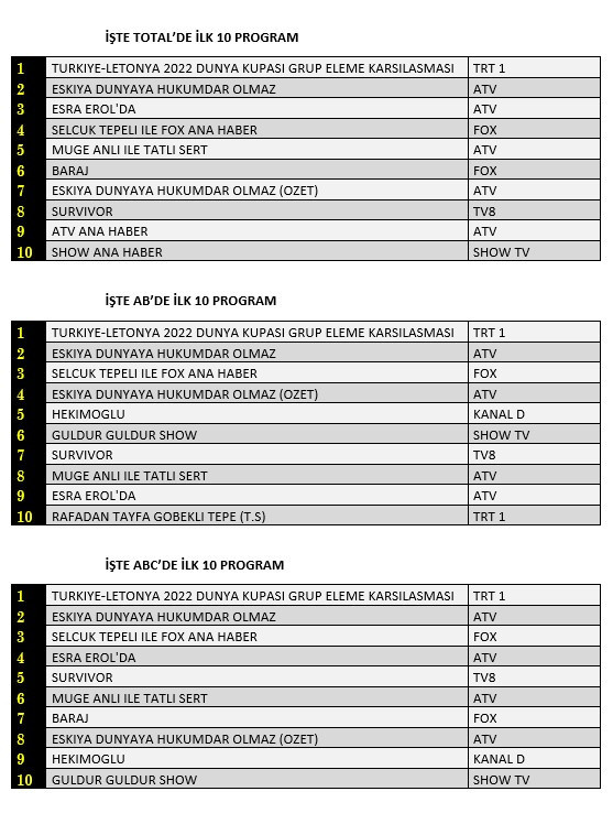 Total'de 1. sırada TRT1’de ekrana gelen “Türkiye-Letonya 2022 Dünya Kupası Grup Eleme Karşılaşması”, 2. sırada ATV’de yayınlanan “Eşkıya Dünyaya Hükümdar Olmaz”, 3. sırada ATV’de izleyiciyle buluşan “Esra Erol’da” programı yer aldı.