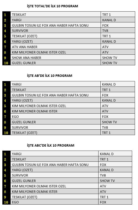 Total'de 1. sırada TRT1’de izleyiciyle buluşan “Teşkilat”, 2. sırada Kanal D’de yayınlanan “Yargı”, 3. sırada “Gülbin Tosun İle Fox Ana Haber Hafta Sonu” yer aldı.