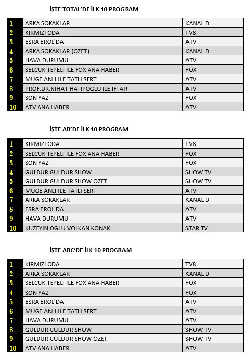 Total'de 1. sırada Kanal D’de ekrana gelen “Arka Sokaklar”, 2. sırada TV8’de yayınlanan “Kırmızı Oda”, 3. sırada ATV’de izleyiciyle buluşan “Esra Erol’da” programı yer aldı.