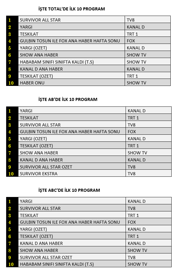 AB'de ise 1. sırada “Yargı”, 2. sırada “Teşkilat” 3. sırada “Survivor All Star” yer aldı.