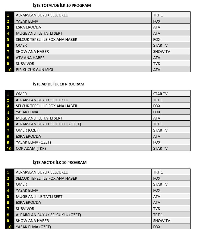 Total'de 1. sırada TRT1’de izleyiciyle buluşan “Alparslan Büyük Selçuklu”, 2. sırada Fox TV’de ekrana gelen “Yasak Elma”, 3. sırada Atv’de yayınlanan “Esra Erol’da” yer aldı.