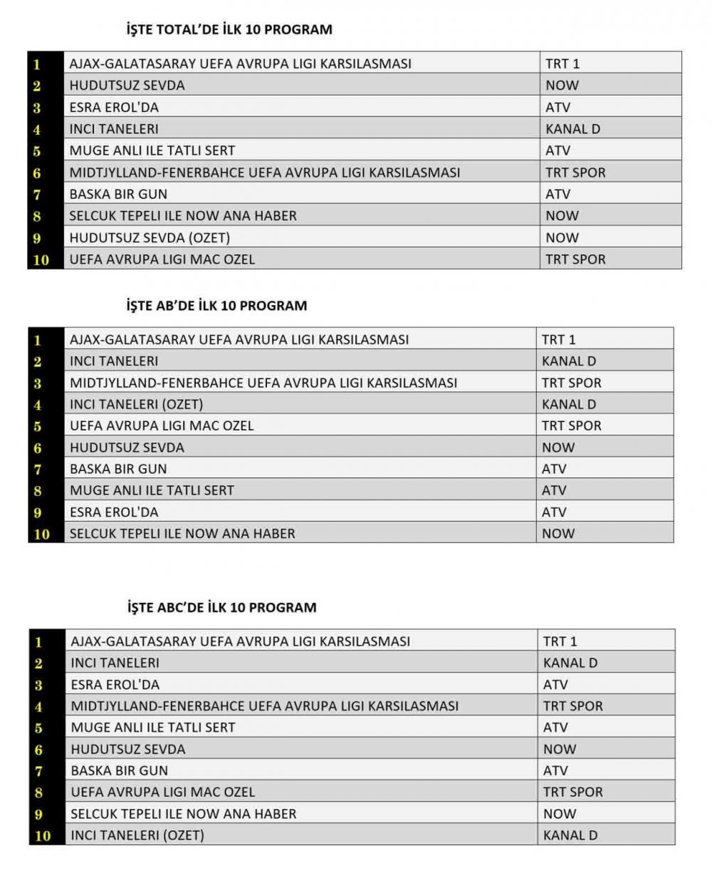 Total kategorisinde TRT1'de yayınlanan Ajax-Galatasaray UEFA Avrupa Ligi Karşılaşması, zirvenin sahibi oldu. İkinci sırada Now TV'de ekrana gelen Hudutsuz Sevda, üçüncü sırada ise Atv'de yayınlanan Esra Erol’da yer aldı.