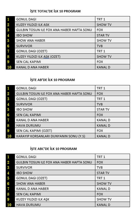 Total'de 1. sırada TRT1’de ekrana gelen “Gönül Dağı”, 2. Sırada “Gülbin Tosun İle Fox Ana Haber Hafta Sonu”, 3. sırada Show TV’de izleyiciyle buluşan “Kuzey Yıldızı İlk Aşk” yer aldı.