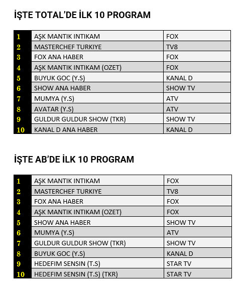AB'de ise 1. sırada “Aşk Mantık İntikam”, 2. sırada “Masterchef Türkiye” 3. sırada “Fox Ana Haber” yer aldı.