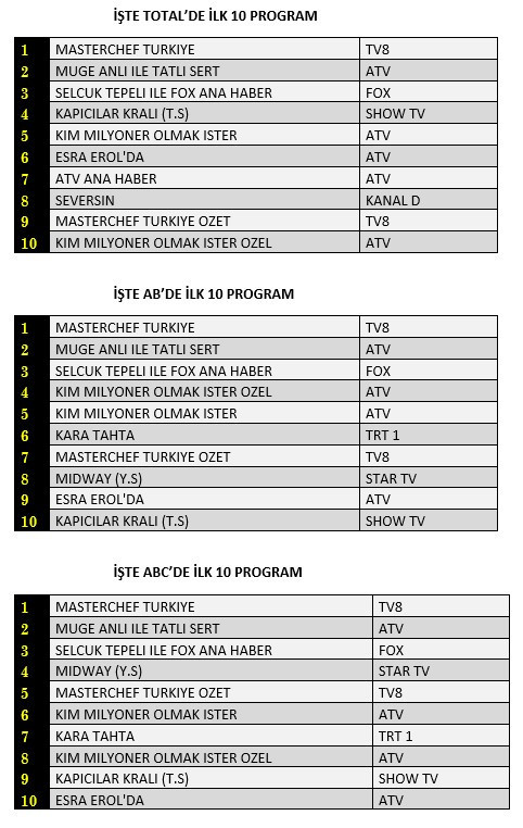 AB'de ise 1. sırada “Masterchef Türkiye”, 2. sırada “Müge Anlı İle Tatlı Sert” 3. sırada “Selçuk Tepeli İle Fox Ana Haber” yer aldı.